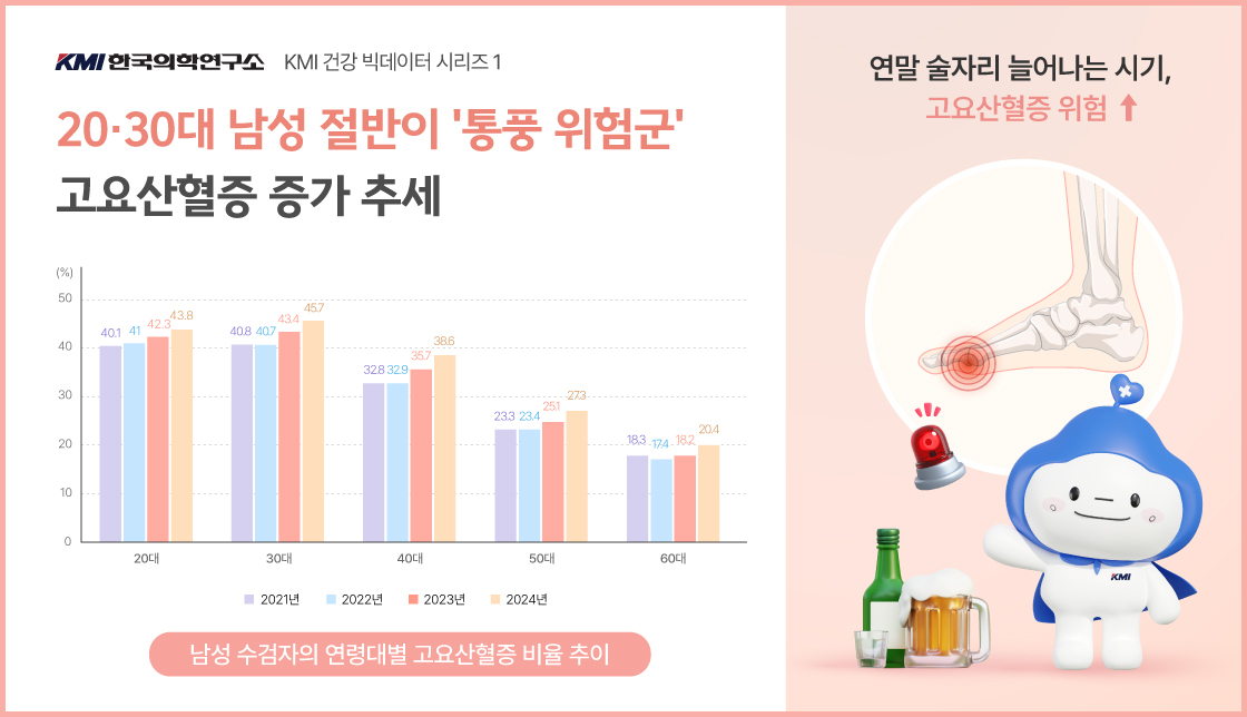▶ KMI “젊은 층 증가세 심각… 정기검진 통한 조기 발견 필수”=KMI연구원 안지현 수석상임연구위원(내과 전문의)은 “고요산혈증은 통풍뿐만 아니라 각종 만성질환의 전조 신호”라며 특히 “젊은 남성층에서 급증하고 있는 만큼 연말연시 음주 문화와 서구화된 식습관에 대한 주의가 필요하다”고 강조했다.