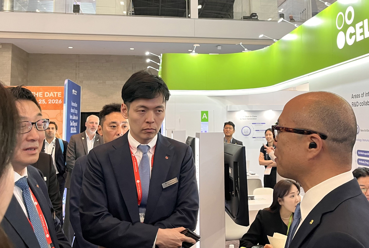 | 지난 6월 16일(현지시간) 신유열 롯데지주 미래성장실장(부사장)이 미국 보스턴에서 열린 2025 바이오 USA에서 셀트리온 부스를 방문해 관계자의 설명을 듣고 있다. [연합] |
