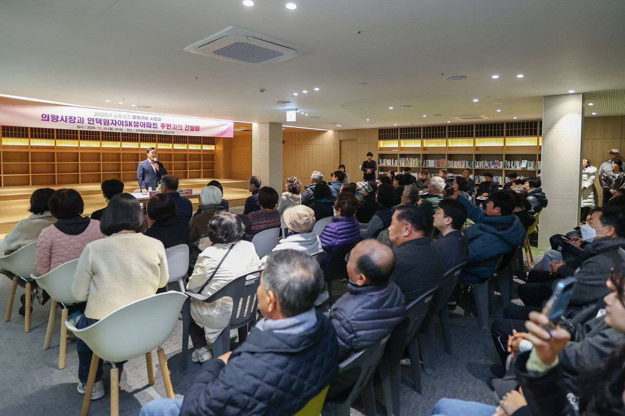 [헤럴드경제=박준환 기자]의왕시(시장 김성제)가 지난 24일 인덕원자이에스케이뷰아파트 작은도서관에서 ‘찾아가는 시장실’을 열고 아파트 주민들과 시정 현안 및 생활 불편 사항에 대해 소통하는 시간을 가졌다.
