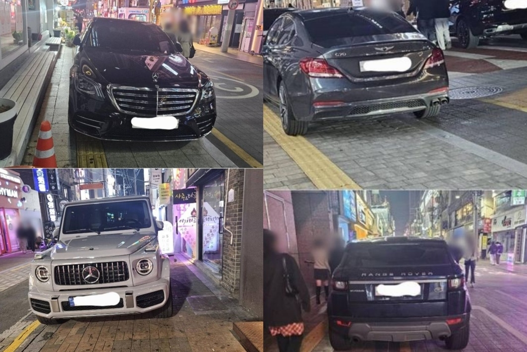 A씨가 공개한 사진에는 벤츠·BMW·랜드로버 등 고급 외제차부터 일반 승용차까지 수십 대가 인도 위에 불법주차돼 있는 모습이 담겼다.