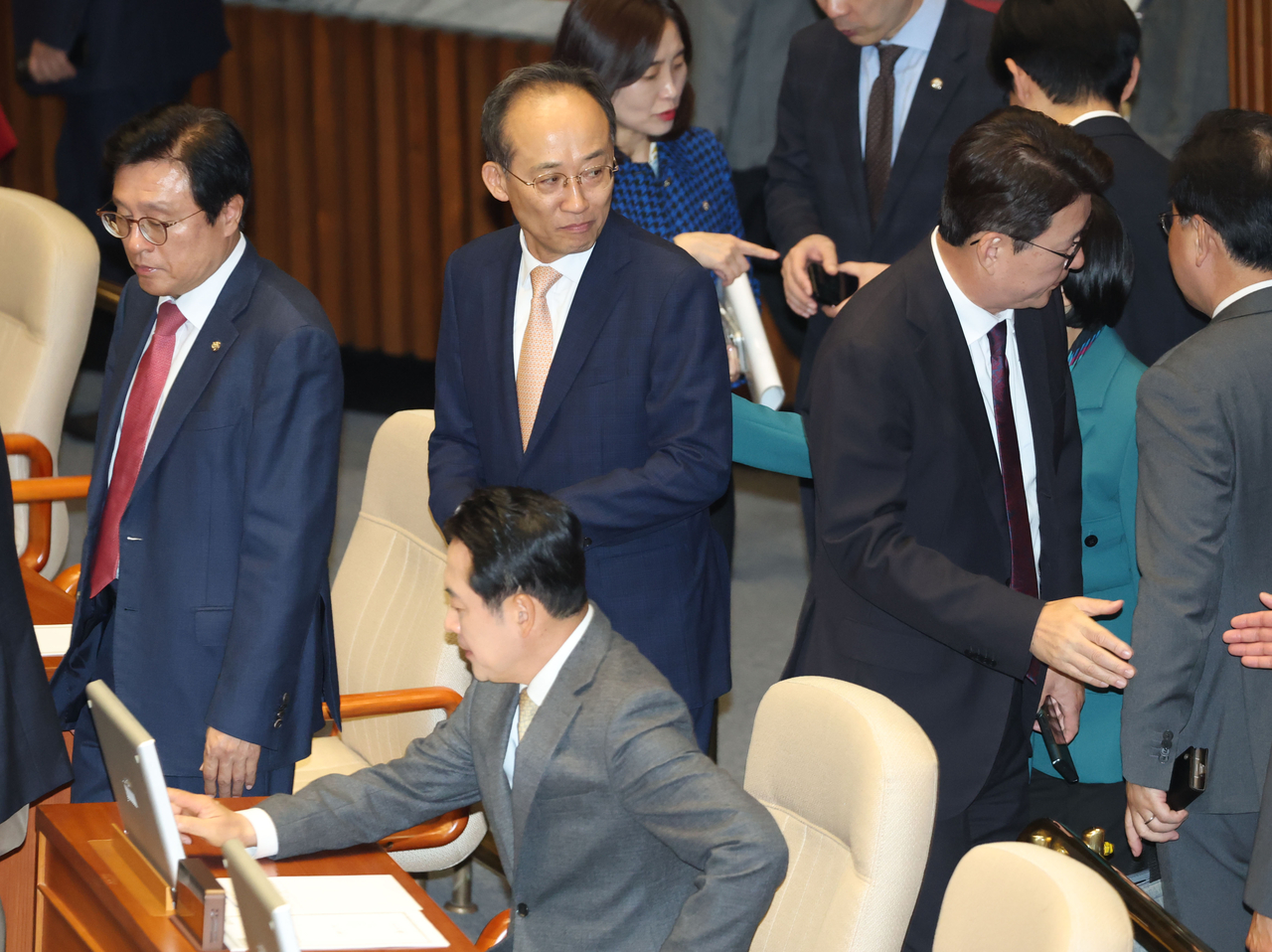 | 내란중요임무종사 혐의로 구속영장이 청구된 추경호 국민의힘 의원이 13일 자신의 체포동의안 보고가 예정된 국회 본회의에 참석하고 있다. [연합] |