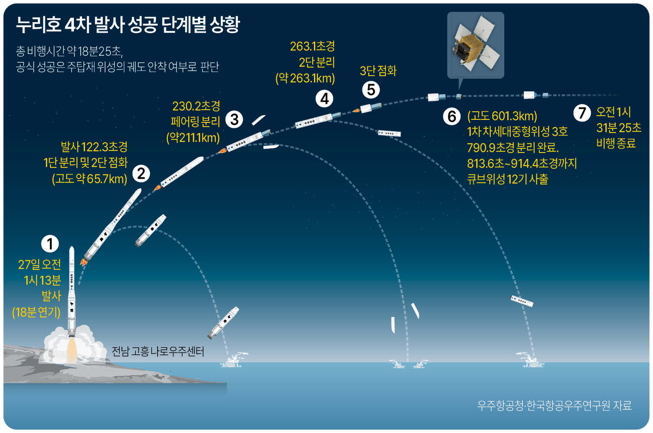이번 누리호 4차 발사에서 주탑재위성 차세대중형위성 3호와 12기의 큐브위성이 목표궤도에 안착하는데 성공했다.