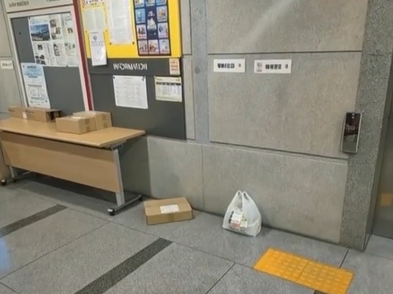 손님은 ‘(음식을) 6층 엘리베이터 앞에 놔달라’고 요청했다. 해당 장소에는 ‘택배(수령)↓ 배달음료↓’라는 문구가 벽에 붙어 있었다. 그 옆에는 긴 탁자가 놓여 있고 그 위에 택배로 온 물건들로 보이는 작은 상자들이 놓여 있었다.