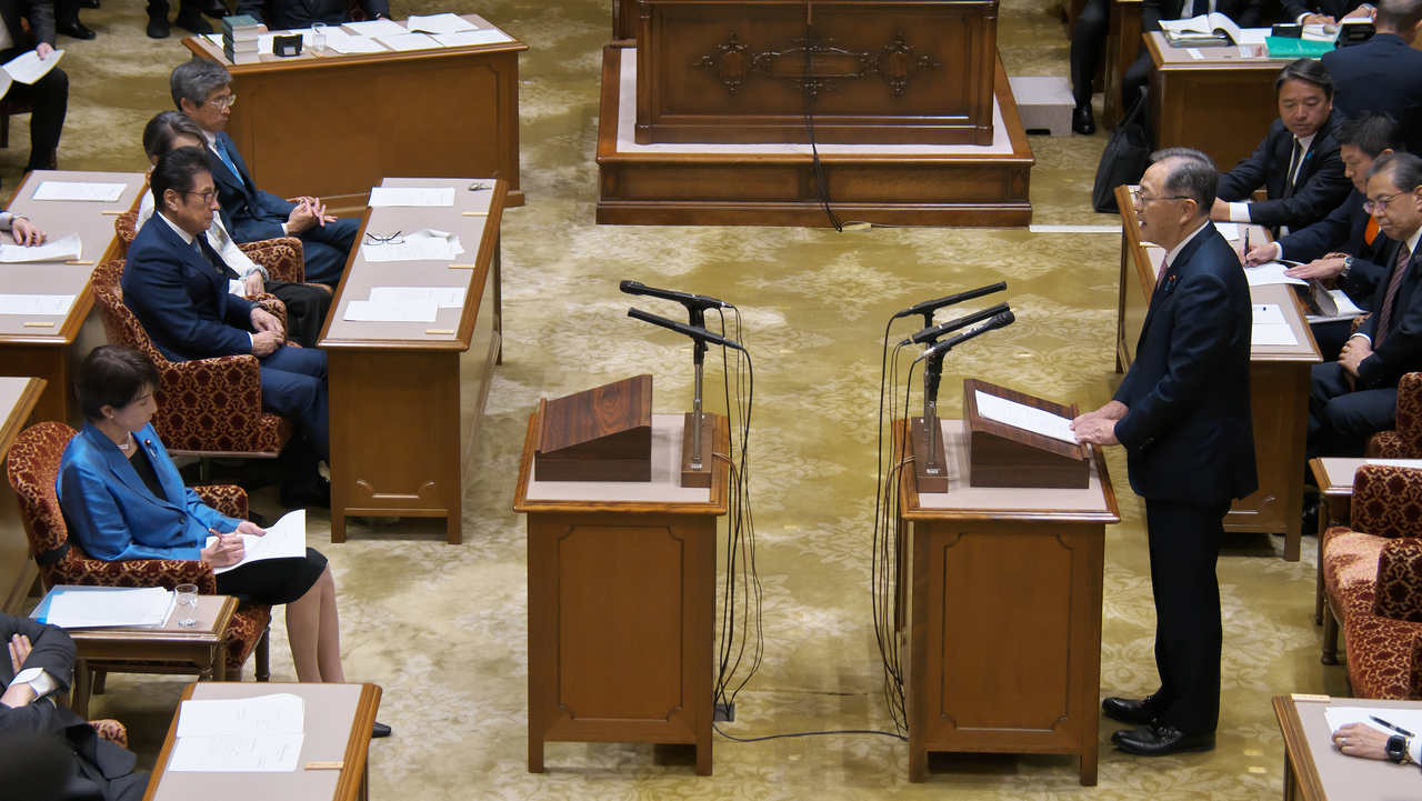| 26일(현지시간) 일본 도쿄 국회에서 열린 당 대표 토론에서, 사이토 데쓰오 공명당 대표 가 다카이치 사나에 일본 총리에게 질문하고 있다. [UPI] |
