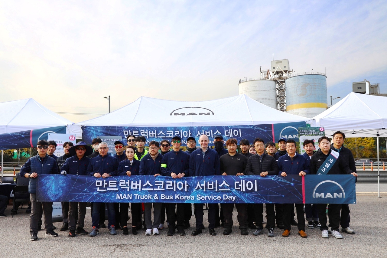 | 만트럭버스코리아 ‘MAN 서비스데이’에 참여한 임직원들이 기념 촬영을 하고 있다. [만트럭버스코리아 제공] |