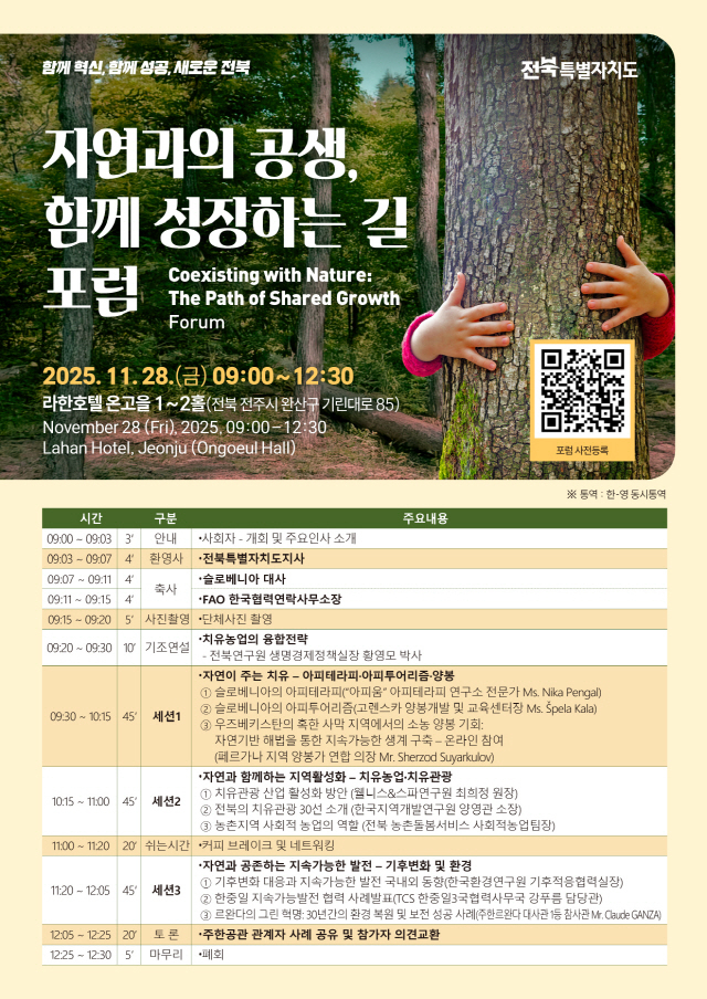28일엔 전주 라한호텔에서 포럼을 개최한다. 포럼은 전북특별자치도지사의 환영사, 슬로베니아 대사 및 FAO 한국협력사무소장의 축사로 개막한다. 이어 ▷자연이 주는 치유 슬로베니아의 아피테라피, 아피투어리즘 소개 ▷자연과 함께하는 지역 활성화 치유관광 및 치유농업 사례 ▷자연과 공존하는 지속가능 발전 기후변화·환경 대응 전략 등 3가지 세션 토론을 벌인다.