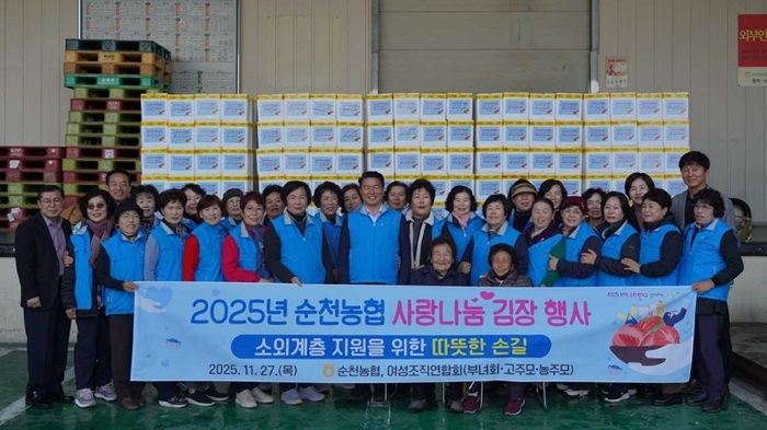 이날 여성조직연합회(부녀회,고주모,농주모) 및 순천농협 임직원 등 50여 명이 참여해 정성껏 담근 김장김치 5kg 400 박스를 지역 내 취약계층 마을 경로당, 복지기관 등에 전달할 예정이다.
