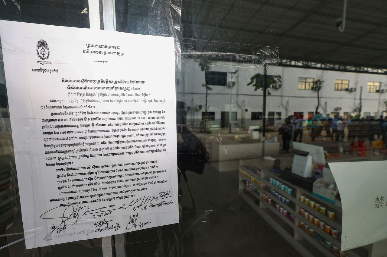 | 23일(현지시간) 캄보디아 범죄단지인 ‘태자단지’ 내부 마트 앞에 크메르어로 적힌 온라인 사기단지 단속 안내문이 붙어있다. [연합] |