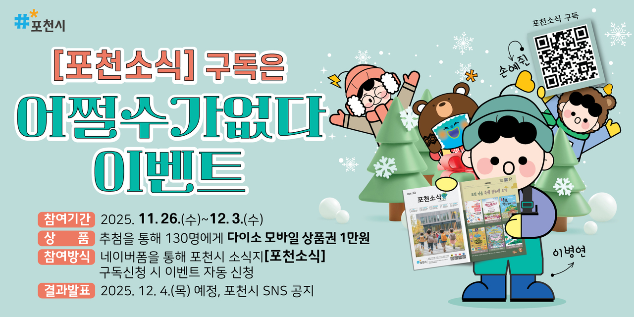 이번 이벤트는 12월 3일까지 진행되며, 시정 소식지 ‘포천소식’을 구독하면 별도의 절차 없이 자동으로 이벤트에 응모된다.