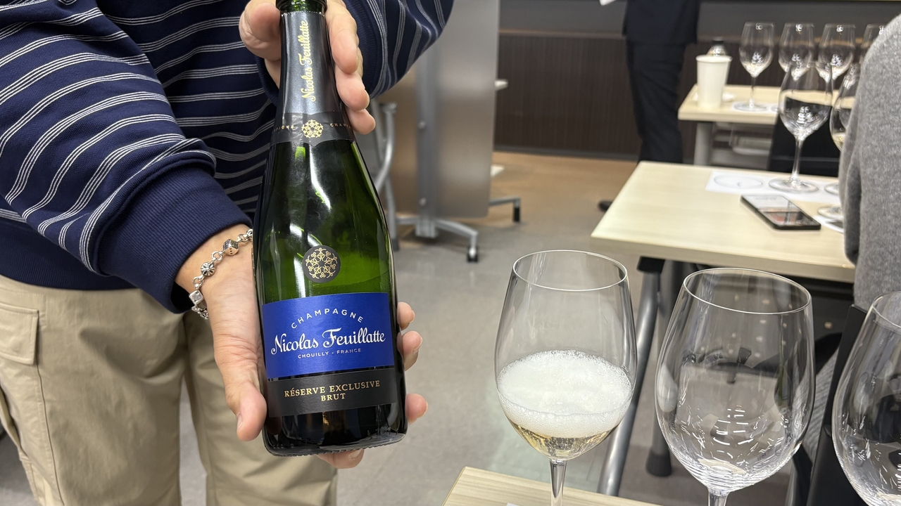니콜라스 푸이야트의 ‘리저브 익스클루시브 브뤼’. 가장 호불호 없이 즐길 수 있는 엔트리 샴페인으로, 서양배와 살구 향이 특징이다. 신현주 기자
