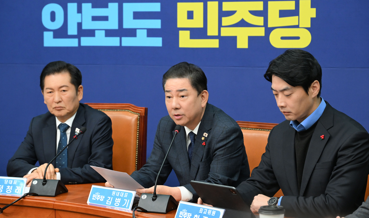 | 김병기(가운데) 더불어민주당 원내대표가 28일 서울 여의도 국회에서 열린 최고위원회의에서 모두발언하고 있다. 이상섭 기자 |