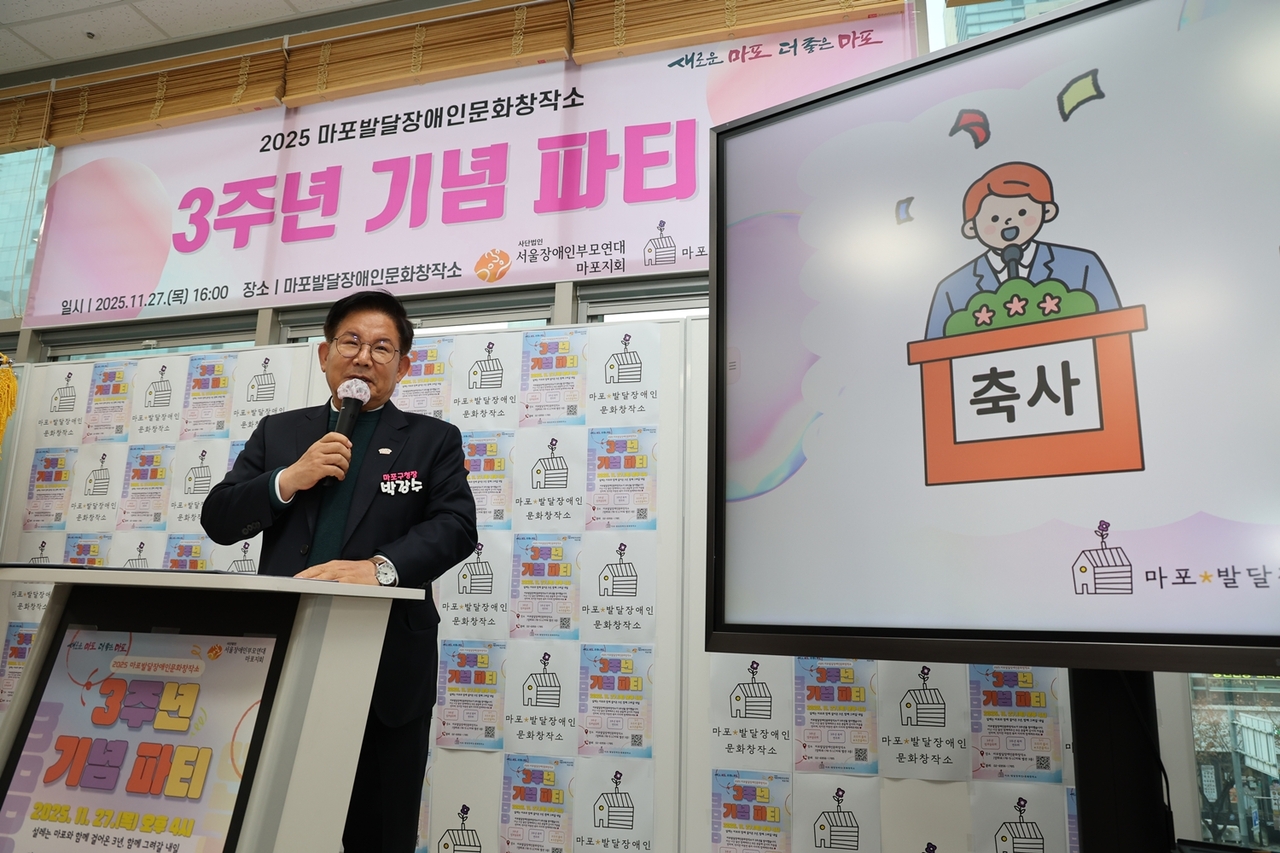 [헤럴드경제=박종일 선임기자]박강수 마포구청장은 11월 27일 오후 4시 ‘마포 발달장애인 문화창작소(양화로 178-5)’ 개관 3주년 기념 파티에 참석해 이용인·가족·운영 관계자들과 따뜻한 축하의 시간을 가졌다.
