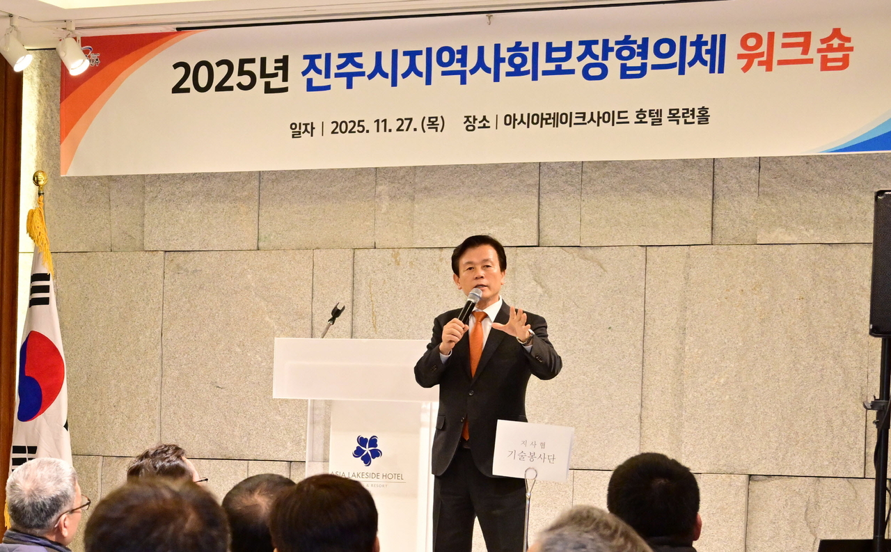 | 조규일 진주시장이 27일 아시아레이크사이드호텔에서 열린 ‘2025 지역사회보장협의체 워크숍’에서 인사말을 하고 있다. [진주시 제공] |