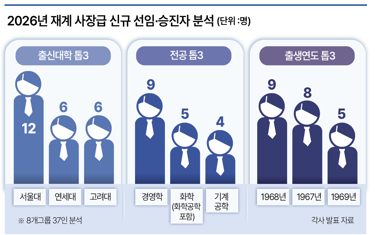 [헤럴드경제=고은결·김현일·정석준 기자] 최근 진행된 각 그룹별 2026년 인사에서 사장급 신규 선임·승진자의 면면을 살펴보면, 서울대 출신이 가장 많았고, 학사 전공은 경영학이 주류를 이뤘으며, 출생연도는 1968년생(원숭이띠)이 가장 큰 비중을 차지했다.
