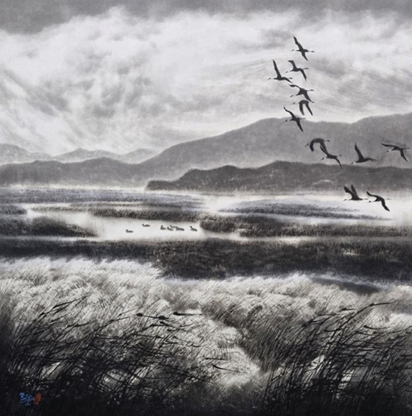 장안순 화백의 작품 ‘흑두루미의 비상’.