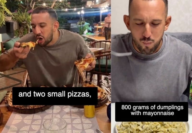 그가 영상을 통해 공개한 식단을 보면, 아침 식단은 빵과 케이크, 점심은 만두 800g, 간식으로 감자칩, 저녁으로 햄버거와 피자 2판 등이었다.