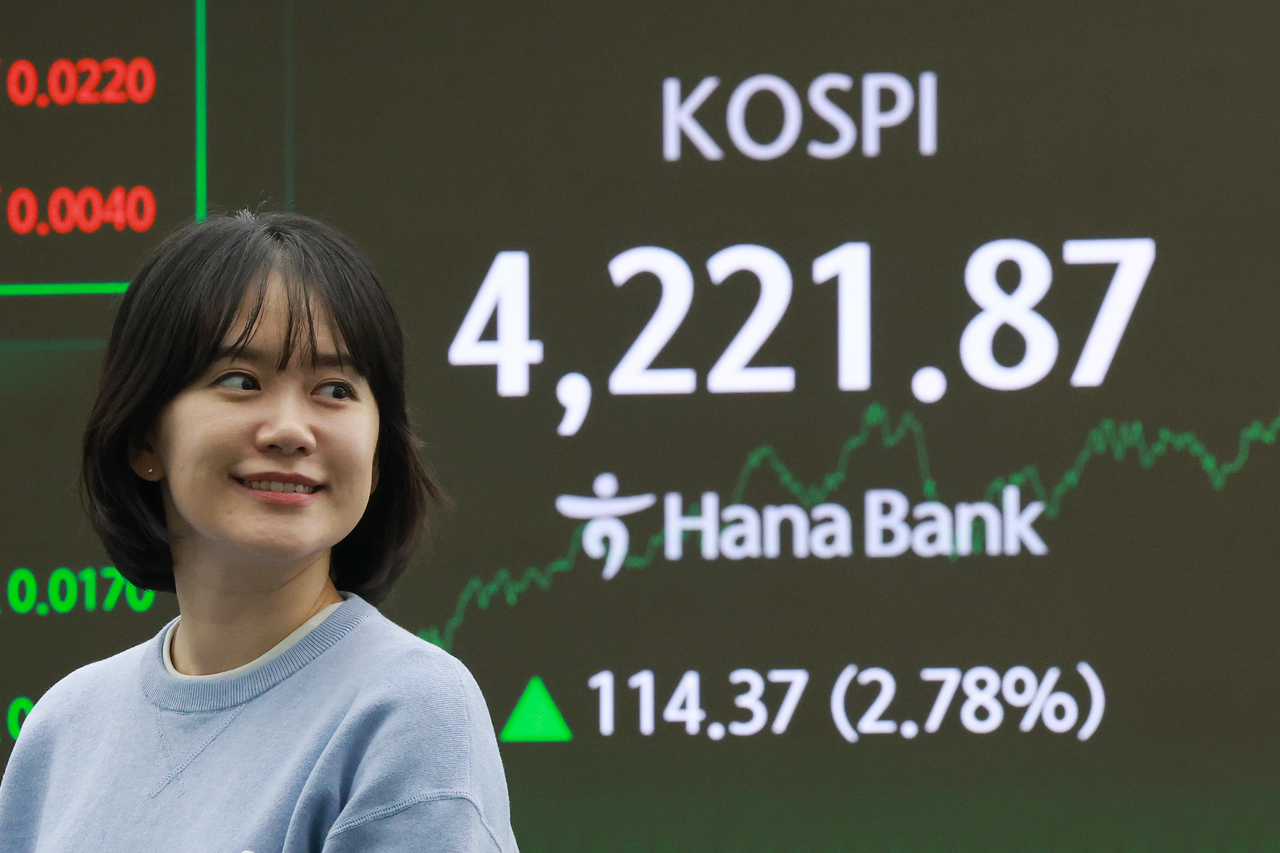 | 코스피가 4200선을 돌파하며 마감한 지난 3일 서울 중구 하나은행 본점 딜링룸에서 딜러가 업무를 보고 있다. [연합] |
