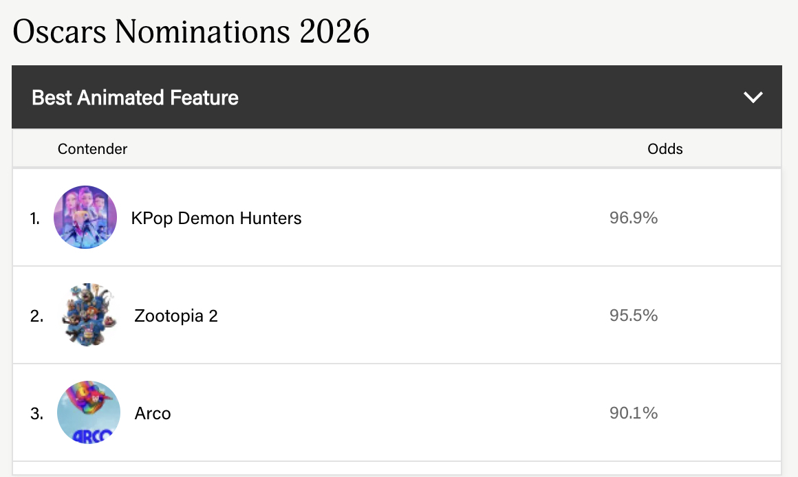 주토피아의 강력한 흥행 열기가 지속된다면 현재 ‘케데헌’ 근소 우위의 판세가 뒤바뀔 가능성도 있다. 아카데미가 비교적 ‘속편’에 호의적이라는 점도 ‘주토피아 2’의 수상 가능성을 밀어올리는 요인 중 하나다. 골든 더비 예측에 따르면 현재 ‘케데헌’의 수상 확률은 96.9%, 그리고 ‘주토피아 2’의 수상확률은 95.5%다.