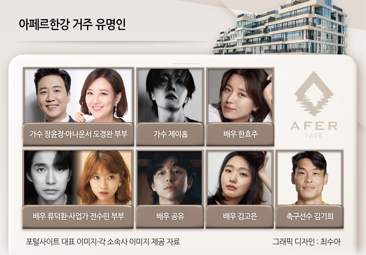[헤럴드경제=서정은 기자] 공유, 김고은, 류덕환·전수린 부부, 수애, 장윤정·도경완 부부, 제이홉, 한효주 등. 이름만 들어도 알 만한 톱 연예인들이 사는 곳. ‘아페르한강’은 입주민의 30% 이상이 연예인이다. 초고가 주택에 유명인들이 산다는 뉴스는 종종 보지만, 아페르한강처럼 한 단지에 밀집해 사는 사례는 드물다. 아페르한강은 준공 일년만에 어떻게 ‘연예인 아파트’라는 타이틀을 얻게 됐을까.
