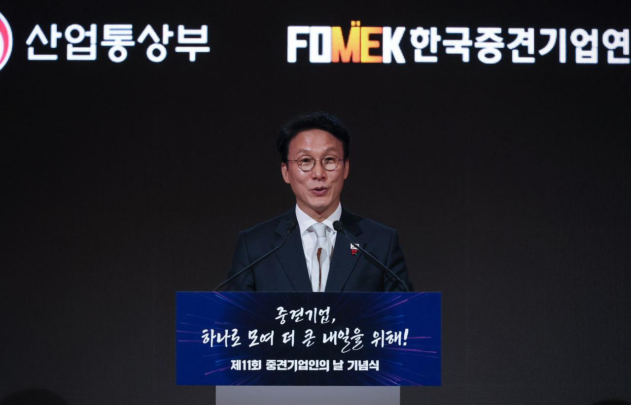 | 김민석 국무총리가 1일 서울 중구 롯데호텔에서 열린 제11회 중견기업인의 날 기념식에서 축사하고 있다. [연합] |