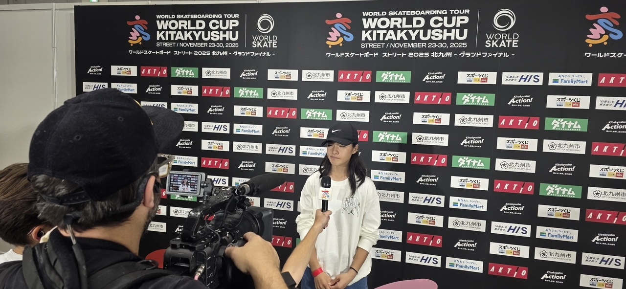 | ‘월드 스케이트보드 투어(WST) 월드컵 기타큐슈 스트리트 2025’에서 4위를 차지한 신지율 선수가 인터뷰를 하고 있다. <사진=대한롤러스포츠연맹> |