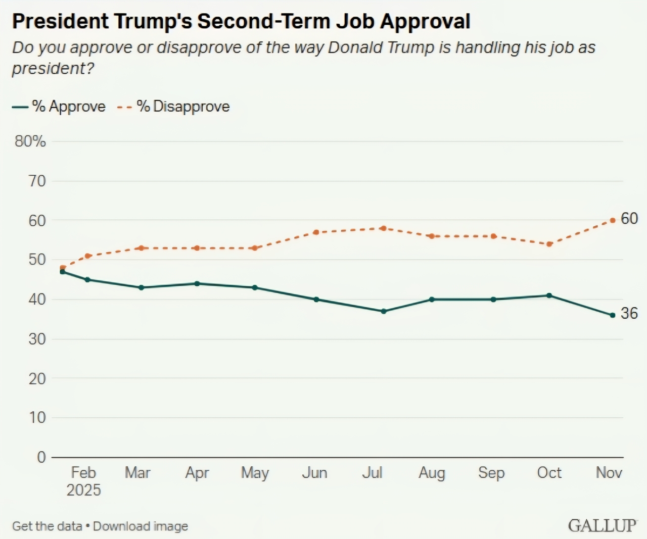 여론조사기관 갤럽이 지난달 3∼25일(현지시간) 미국 성인 1321명을 상대로 조사해 28일 발표한 여론조사(표본오차 ±4%포인트)에서 트럼프 대통령의 직무수행에 대한 긍정률은 36%로 10월보다 5%포인트(p) 낮아졌다. 부정률은 6%p 오른 60%로 나타났다.
