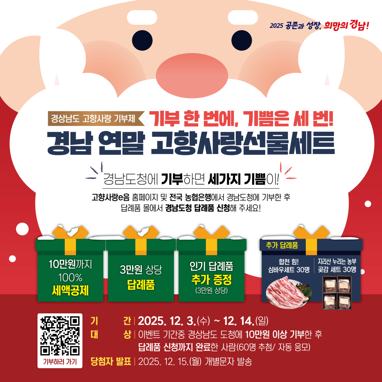 [헤럴드경제(창원)=황상욱 기자] 경남도가 연말정산 시즌을 맞아 고향사랑기부제 참여자에게 세액공제·답례품·특산품 추가 증정까지 제공하는 연말 특별 이벤트를 오는 3일부터 14일까지 진행한다고 2일 밝혔다. 지난해 전체 모금액의 47%가 12월에 집중된 흐름에 맞춰 올해는 당첨 인원과 경품 규모를 대폭 확대해 기부 참여를 끌어올린다는 전략이다.