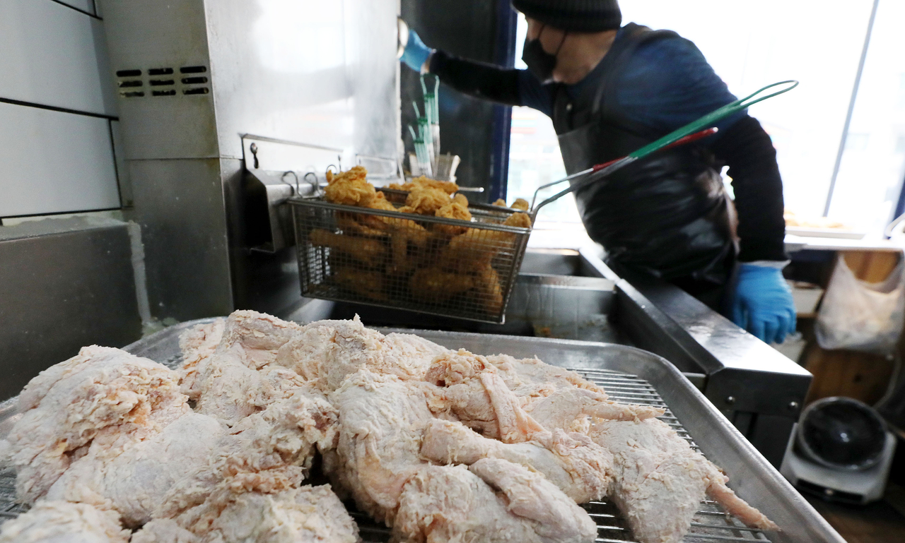 | 서울 시내 한 치킨 가맹점에서 점주가 치킨을 튀기고 있다. [뉴시스] |