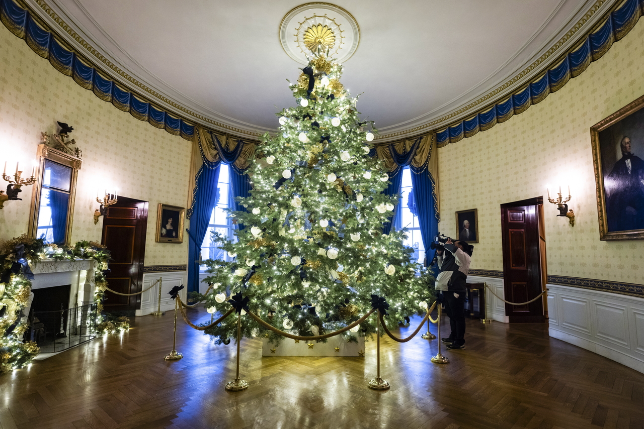 우선 본관 1층 응접실인 블루룸에는 미시간주에서 온 5.4m 높이의 흰색 전나무로 트리를 세웠다. 이는 잘 자란 트리를 기증받는 관례에 따른 것이기도 하다.