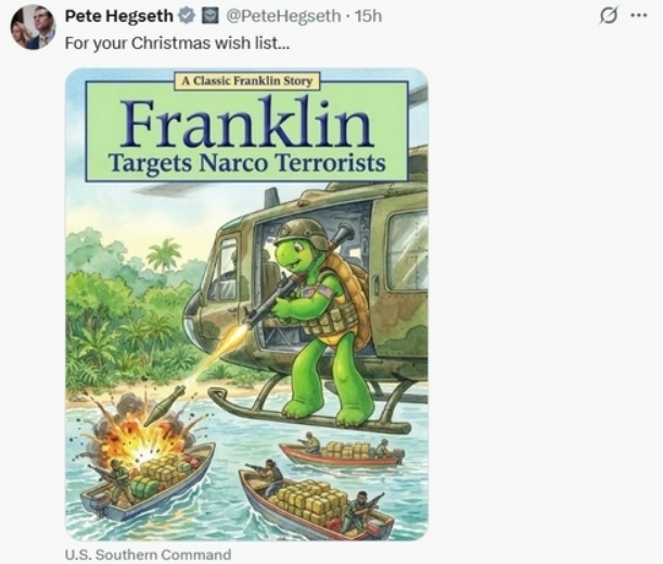 헤그세스 장관은 지난달 30일(현지시간) 밤 자신의 엑스(옛 트위터) 계정에 “당신의 크리스마스 위시리스트용”이라는 글과 함께 그림을 올렸다. 이는 캐나다의 아동용 책 시리즈 ‘프랭클린 거북이’(Franklin the turtle)의 주인공 캐릭터가 헬기에서 바다의 선박들을 폭격해 격침하는 장면이 담긴 책 표지로, 실제 책은 아닌 패러디물이다.