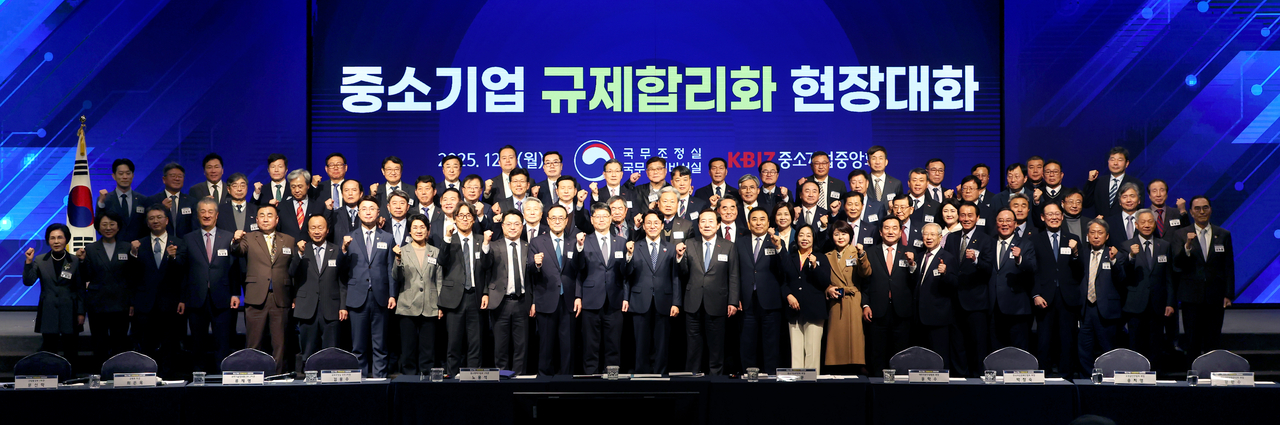 | 김민석 국무총리(첫째줄 왼쪽에서 7번째)가 1일 여의도 중소기업중앙회 K비즈홀에서 열린 ‘중소기업 규제합리화 현장대화’ 행사에 참석해 “중견, 중소기업 규제 문제를 가장 우선순위에 두겠다”고 말했다. [중기중앙회] |