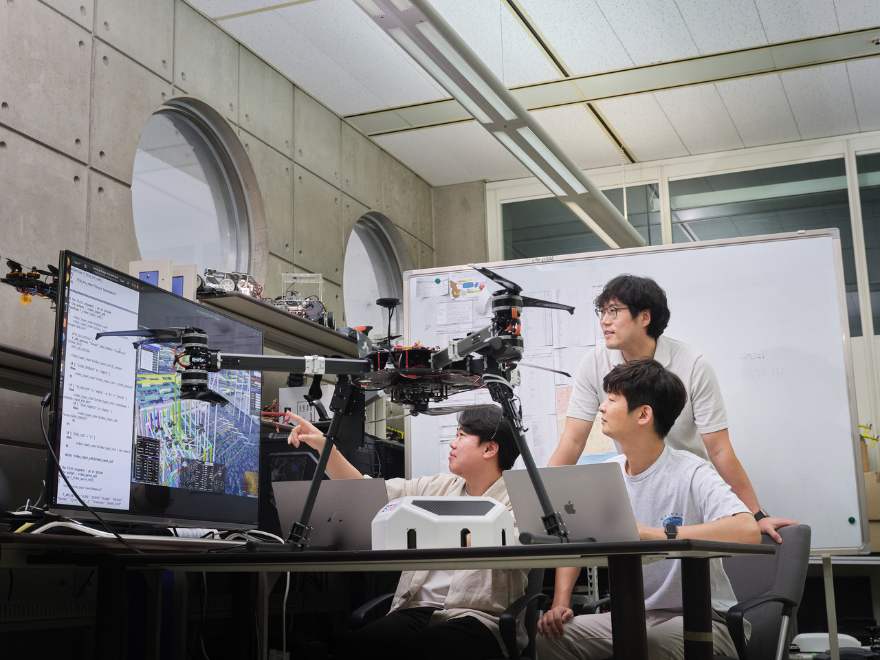 | ETRI 에어모빌리티연구본부 소속 연구진이 DNA+드론 시스템의 실시간 자율비행 알고리즘 작동 상태를 점검하고 있다.[ETRI 제공] |
