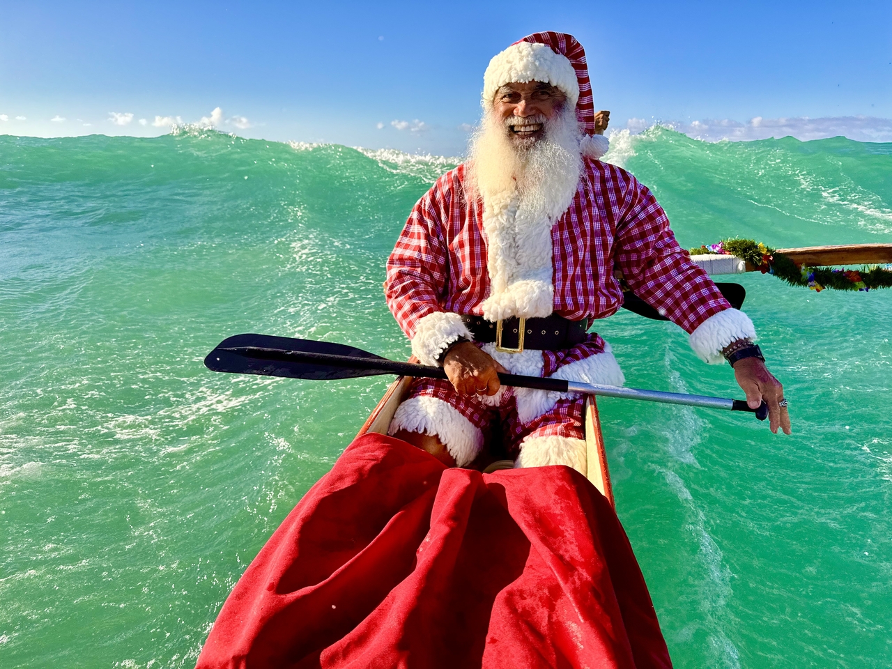 | 하와이 산타 할아버지가 신났다. 하와이 아웃리거 와이키키 산타 카누행사는 20년 전통을 가지고 있다.[아웃리거 와이키키 제공] |