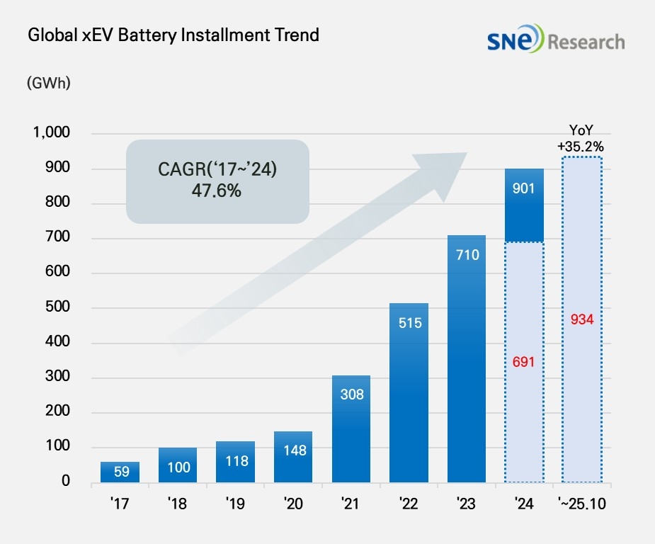 2일 에너지 전문 시장조사업체 SNE리서치에 따르면 1~10월 세계 각국에 등록된 전기차(플러그인하이브리드, 하이브리드차 포함)에 탑재된 총 배터리 사용량은 약 933.5GWh로 전년 동기 대비 35.2% 성장했다.
