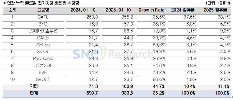 LG에너지솔루션은 전년 동기 대비 12.8%(86.5GWh) 성장하며 3위를 유지했고 SK온은 19.3%(37.7GWh)의 성장률을 기록해 6위에 올랐다. 반면, 삼성SDI는 4.6%(25.1GWh) 감소한 것으로 나타났다.