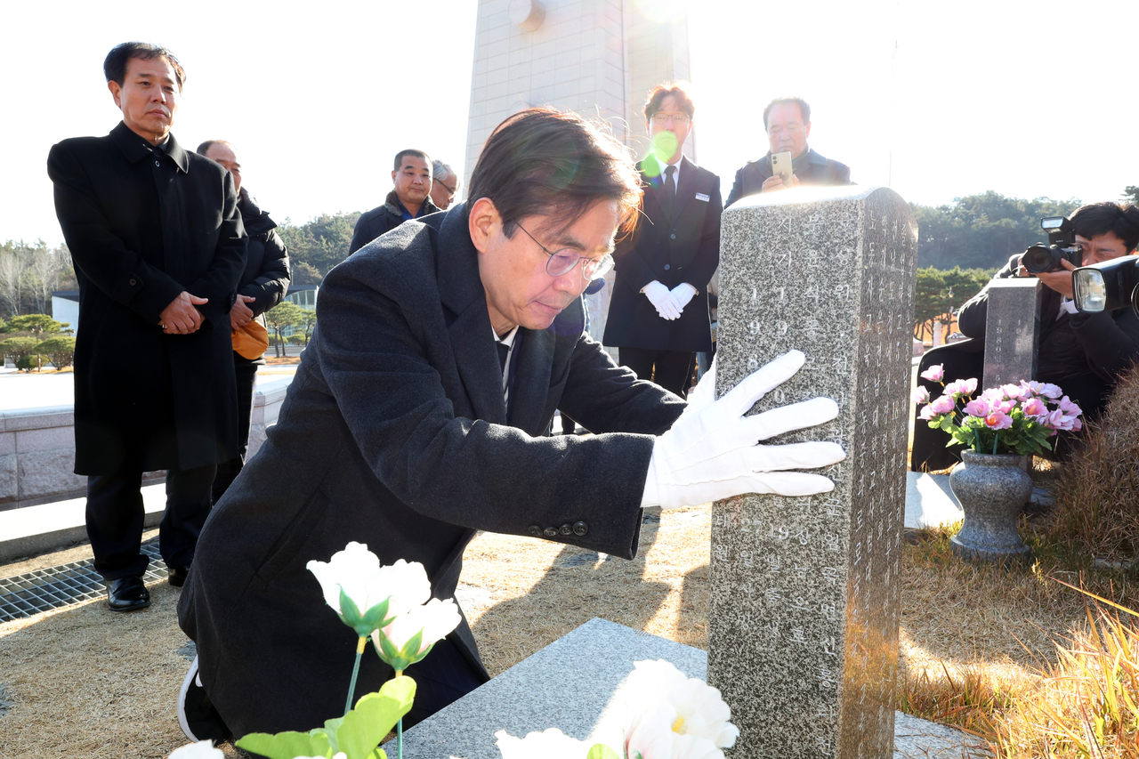 | 12·3 비상계엄 사태 1주년인 3일 오후 광주 북구 국립 5·18 민주묘지에서 국민의힘 조경태 의원이 고 윤상원 열사의 묘소를 참배하고 있다. [연합] |