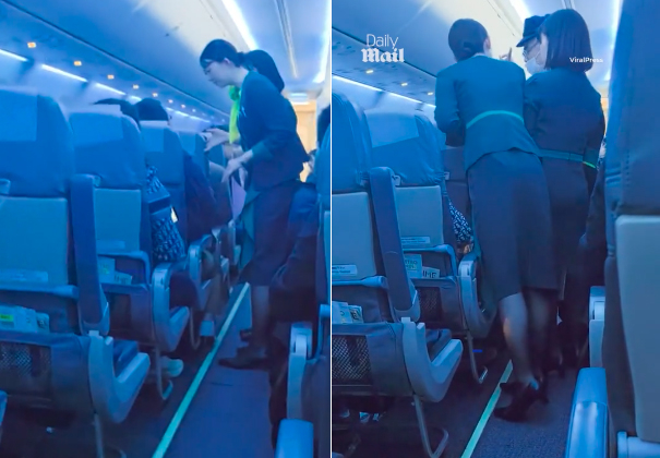 공개된 영상에는 승무원들이 문제를 해결하기 위해 승객들을 오가며 분주한 모습과 함께 결국 경찰이 출동하는 모습이 담겼다.