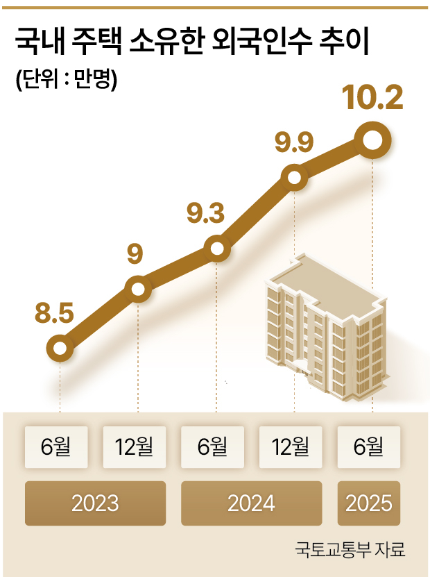 국토교통부에 따르면, 올해 6월 기준 국내에 주택으로 보유하고 있는 외국인은 처음으로 10만명을 넘어섰다. 중국 국적이 6만여 명으로 가장 많았고, 이들이 보유한 주택은 전체 약 10만4000가구 중 5만9000가구인 것으로 나타났다.
