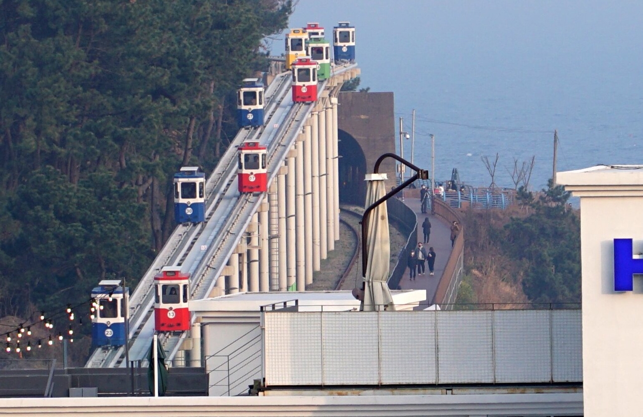 | 시그니엘부산에서 내려다본 부산 미포 블루라인 모노레일 풍경 |