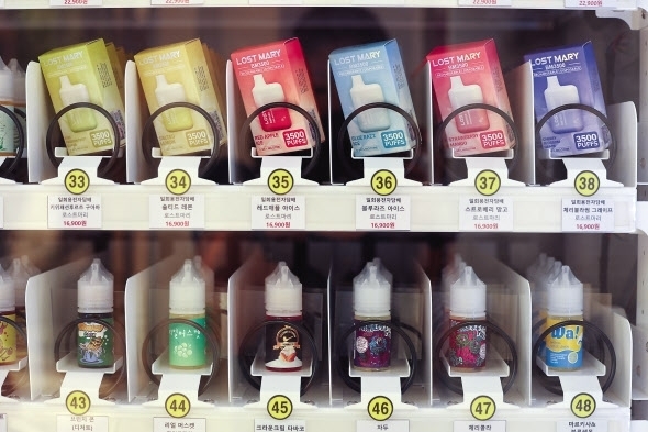 | 서울 마포구의 한 무인 전자담배 판매점에 설치된 자동판매기에 합성니코틴 액상형 전자담배가 진열돼 있다. [연합] |