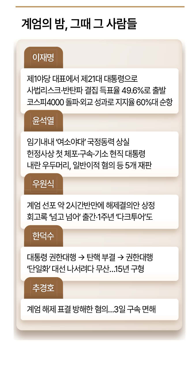 지난해 12월3일 밤 반헌법적 비상계엄이 선포되고 꼭 1년. 그 사이 비상계엄 선포와 해제를 이끌었던 주요 인물들의 명암은 극명하게 엇갈렸다. 윤석열 전 대통령은 헌정사상 첫 구속·기소·체포된 현직 대통령이라는 오명을 쓰고 내란 우두머리로 재판을 받게 됐다. 계엄군의 표적이었던 이재명 당시 제1야당 대표는 지지율 60%의 대통령이 됐다. 한덕수 전 총리는 대통령 권한대행과 ‘권한대행 탄핵’, 대선 출마 등을 거쳐 윤석열 정권 수성에 나섰지만 실패로 돌아갔다. 우원식 국회의장은 국회를 지켜내고 계엄 해제 표결을 이끈 주역으로 떠올랐다.