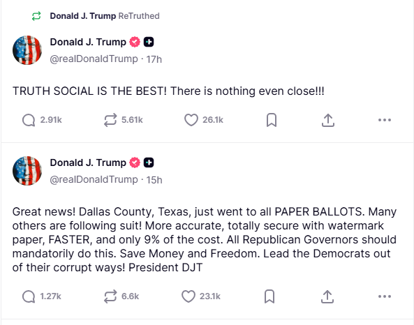 트럼프 대통령은 자정 무렵 게시를 멈췄지만 다음 날 오전 곧바로 조지아·테네시 등 주지사·하원의원 선거에서 공화당 후보 지지를 촉구하며 SNS 활동을 재개했다. 그는 “트루스소셜이 최고다. 그 어떤 것도 따라올 수 없다!!!”라는 글도 두 차례 올렸다.
