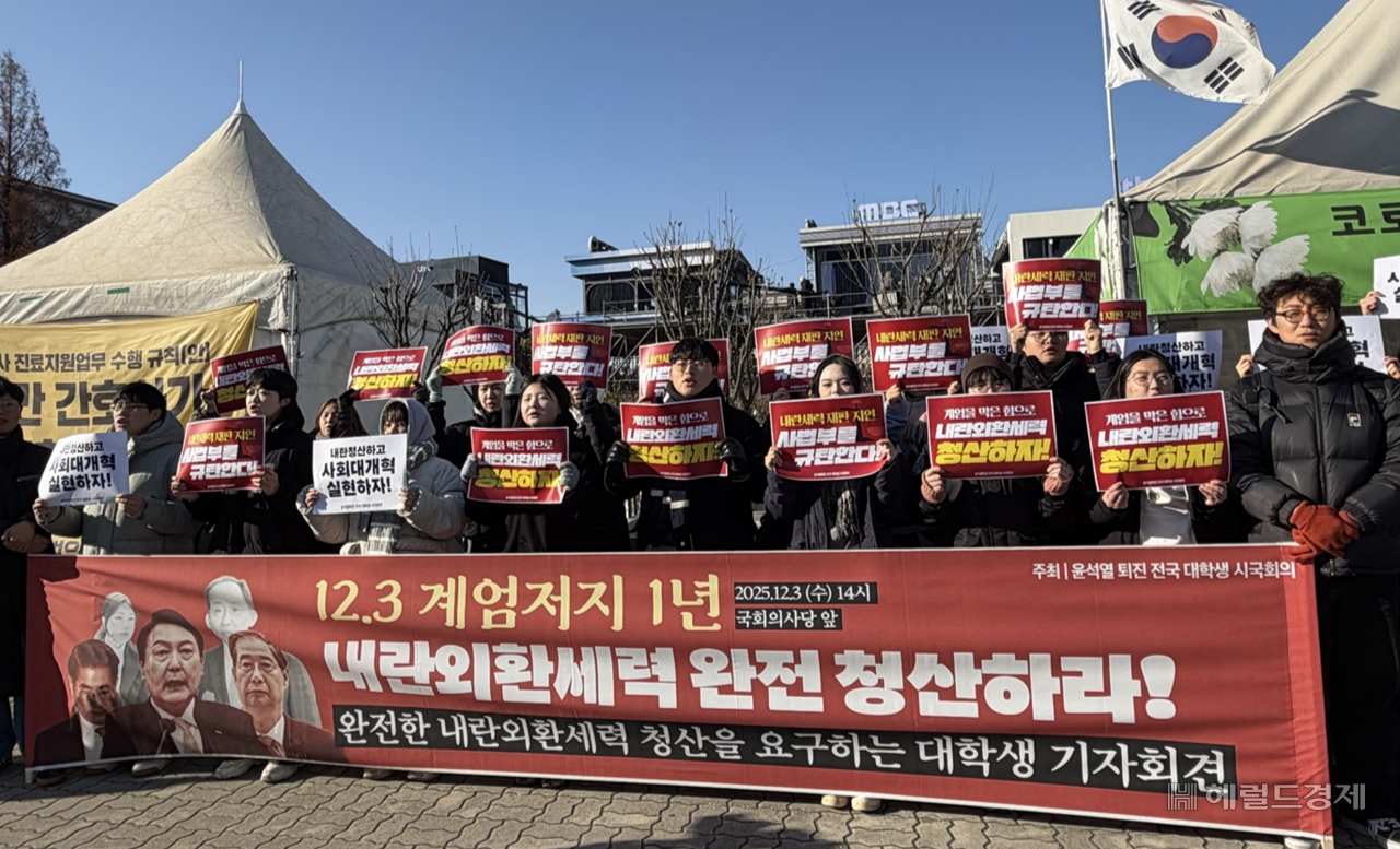 이 단체는 3일 오후 국회 앞에서 12·3 비상계엄 선포 1년을 맞아 ‘완전한 내란·외환세력 청산을 요구하는 기자회견’을 진행했다. 이들은 “1년 전 오늘, 대학생과 시민들은 파괴된 민주주의를 지켜내기 위해 국회 앞으로 달려갔다”라며 “대학생과 시민들의 외침과 행동으로 윤석열을 파면시켰다”고 말했다. 그러면서 “내란수괴 윤석열과 내란 세력들은 여전히 제대로 된 처벌을 받지 않고 있다”고 주장했다.