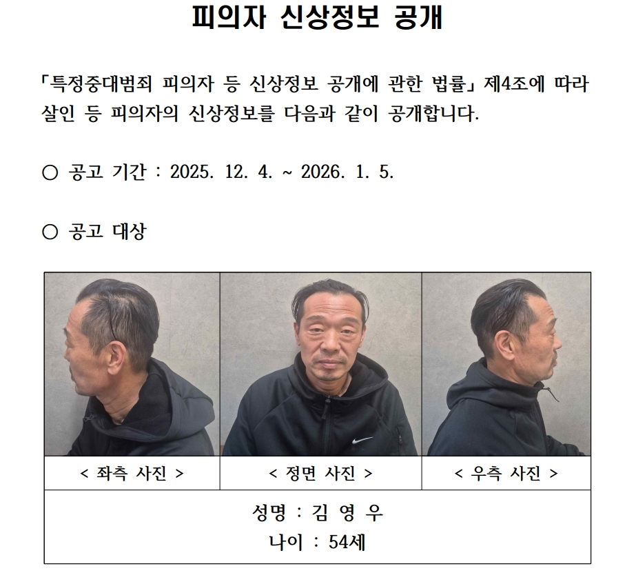 | 청주 장기실종 여성을 살인한 혐의를 받는 김영우(54)의 신상정보가 4일 공개됐다. 충북 지역에서 범죄자의 신상정보가 공개된 것은 이번이 처음이다. [충북청 홈페이지] |