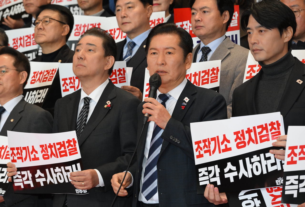 | 정청래 더불어민주당 대표가 4일 오전 서울 여의도 국회 본관 로텐더홀 계단에서 윤석열 정치검찰의 조작기소 책임자 처벌 촉구를 위한 규탄대회에서 모두발언하고 있다. 이상섭 기자 |