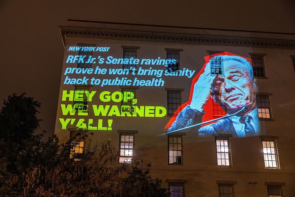 | 보건의료 시민단체 ‘우리의 의료 보호’‘가 지난 9월 워싱턴D.C.의 공화당 전국위원회 건물에 로버트 케네디 주니어 장관의 백신 정책을 비판하는 조명을 비췄다.[게티이미지] |