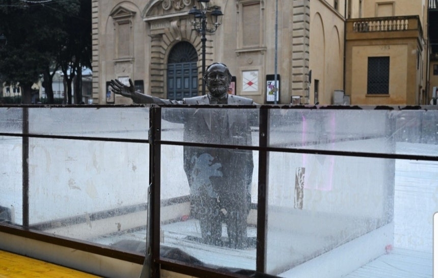 이 광장엔 지난 2007년 세상을 떠난 파바로티의 실물 크기 기념 동상이 있는데 아이스링크 설치 때문에 사실상 ‘갇힌’ 상태가 됐다. 게다가 동상의 무릎 아래부터는 기초공사 시설에 가려 보이지도 않는다.