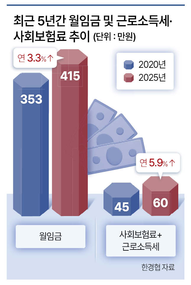 4일 한국경제인협회(한경협)의 분석에 따르면 최근 5년간 근로자 월 임금이 2020년 352만7000원에서 2025년 415만4000원으로 연평균 3.3% 증가하는 동안 월급에서 원천징수되는 근로소득세와 사회보험료의 합은 2020년 44만8000원에서 2025년 59만6000원으로 연평균 5.9% 증가한 것으로 나타났다.
