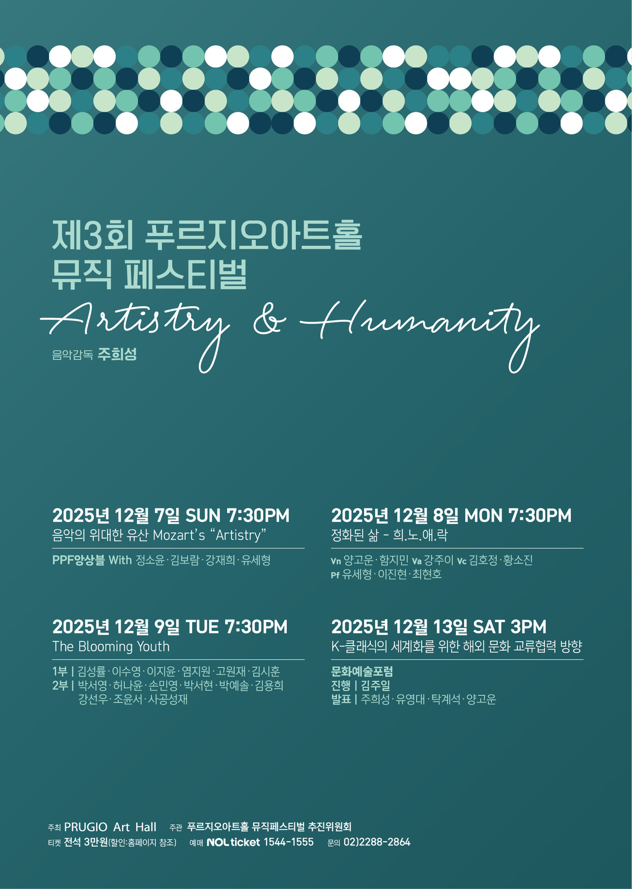 푸르지오아트홀(대표 김주일)은 오는 12월 7일부터 13일까지 푸르지오아트홀 뮤직페스티벌을 개최한다고 4일 밝혔다. 올해로 3회를 맞는 페스티벌은 급변하는 시대 속에서도 음악이 지닌 본질적 가치와 인간적 울림을 되새기는 장이 될 예정이다. 올해의 주제는 ‘Artistry & Humanity’로, 예술성과 인간미의 조화를 통해 음악이 사회와 개인에게 어떤 의미를 가지는지 깊이 있게 탐구한다.