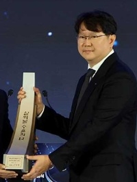 | 곽동신 한미반도체 회장이 4일 서울 코엑스에서 열린 ‘무역의 날’ 기념식에서 ‘3억불 수출탑’을 받고 있다. |